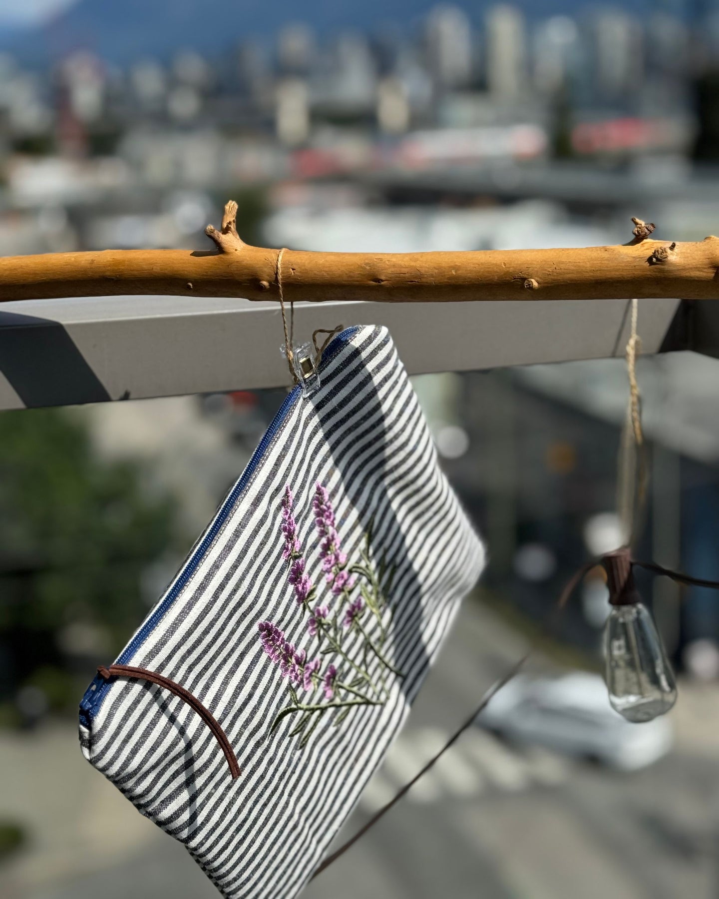 Bring a little wild charm wherever you go. This pouch features a delicate lavender embroidery on navy-and-white striped fabric — calming and bold all at once. The back reminds you of your inner spark with “LITTLE WILD THING” stitched in deep brown thread.