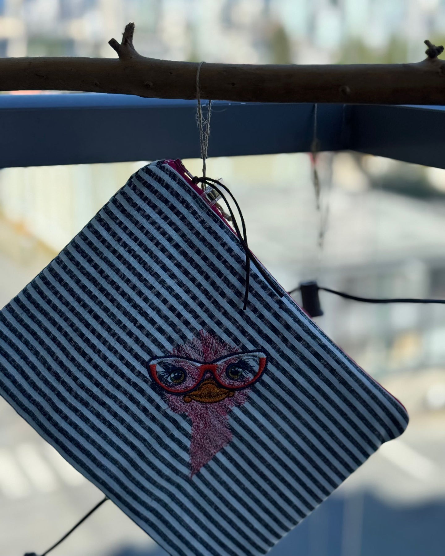 Stripes, sass, and a whole lot of heart. This one-of-a-kind BulliBag is a walking pep talk — one side features a gloriously embroidered ostrich rocking red glasses and knowing eyes, while the other reminds you (and everyone else) to Be Kind to Your Mind in bold, groovy lettering.