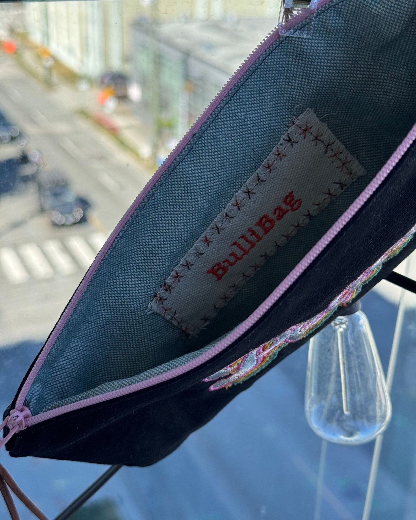 Keep good vibes close with the Peace & Petals Pouch—a sweet and sturdy handmade pouch that’s as cheerful as it is useful. One side features a pastel rainbow “Peace” embroidery, and the flip side is bursting with retro floral charm and a butterfly friend. Fully lined and finished with a soft pink zipper and suede pull, this BulliBag original is made to carry your essentials with a smile. Great as a makeup bag, pencil case, or a peace-loving clutch.
