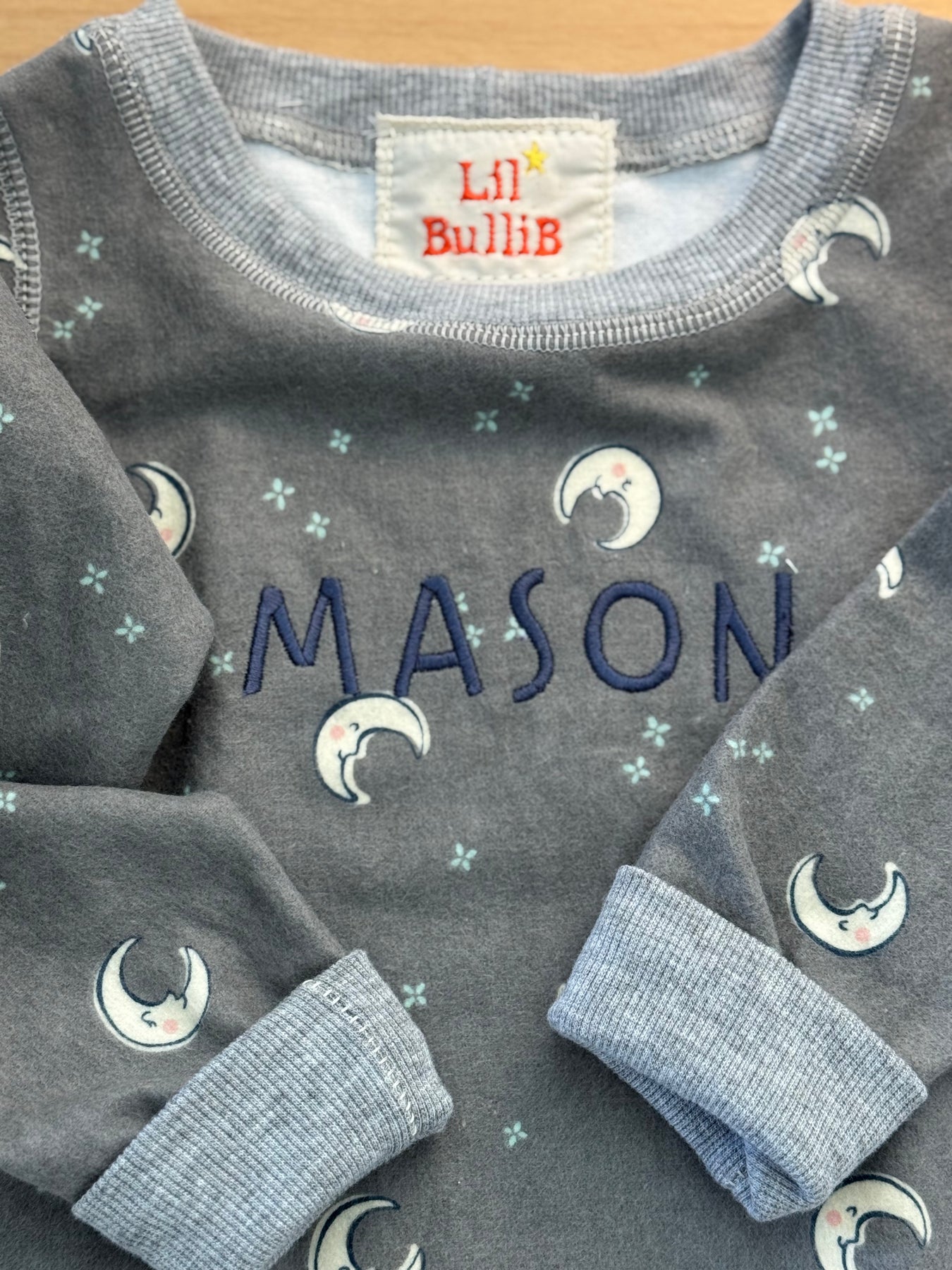 Cozy, custom, and made with care. These soft grey PJ’s feature a sweet moon-and-stars print and your little one’s name stitched right on the front. Perfect for bedtime snuggles, thoughtful gifts, or keepsakes that last. • Available in baby and toddler sizes • 100% cotton blend for comfort and durability • Personalized with embroidered name (up to 10 letters) • Machine washable