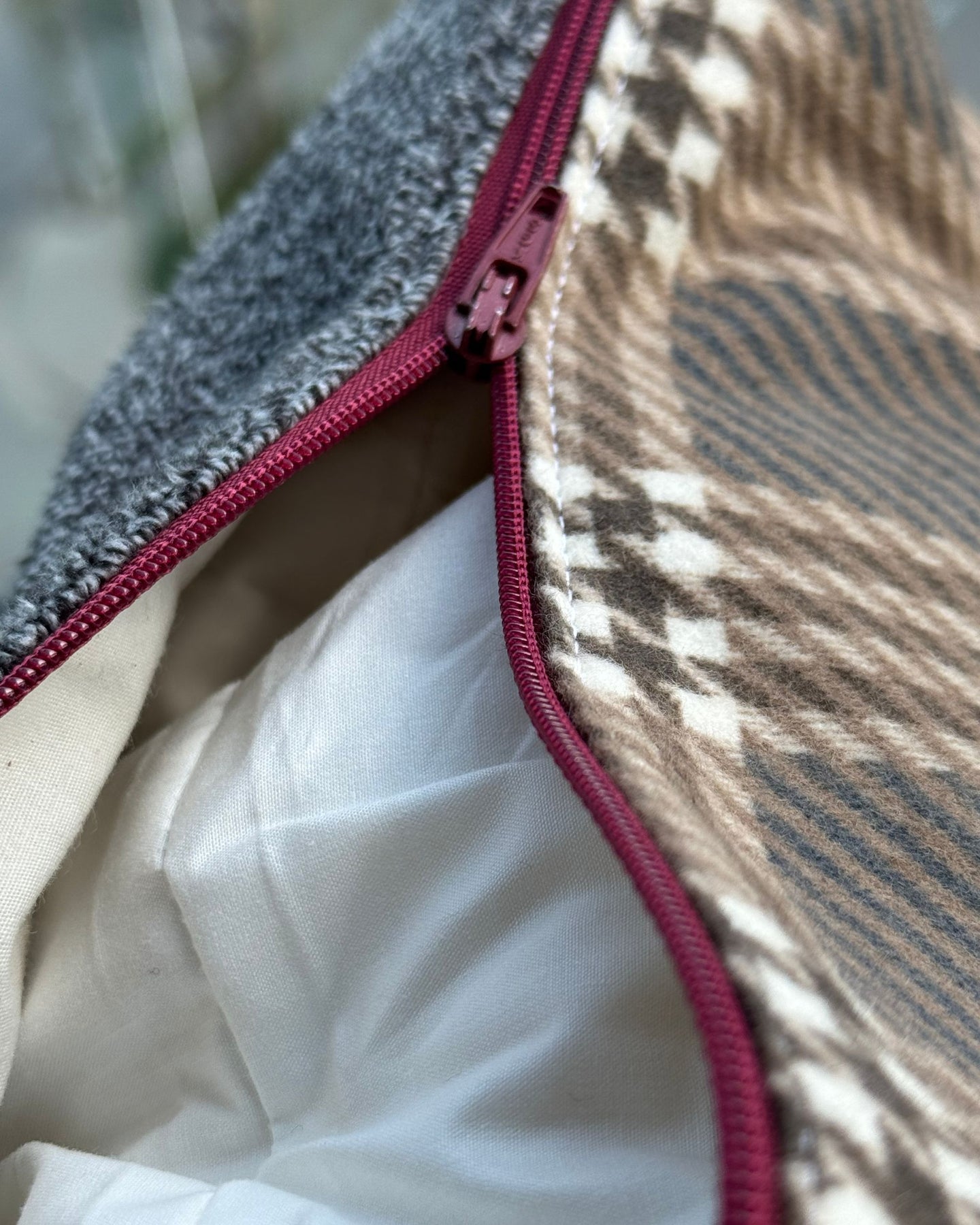 Our Nickname Pillow features a custom appliqué word or name of your choice stitched onto a cozy brown plaid front made from soft Fireside fabric. The back is a snuggly grey Fireside fleece, designed for ultimate comfort and warmth. Each letter is made with a unique fabric to add charm and personality.