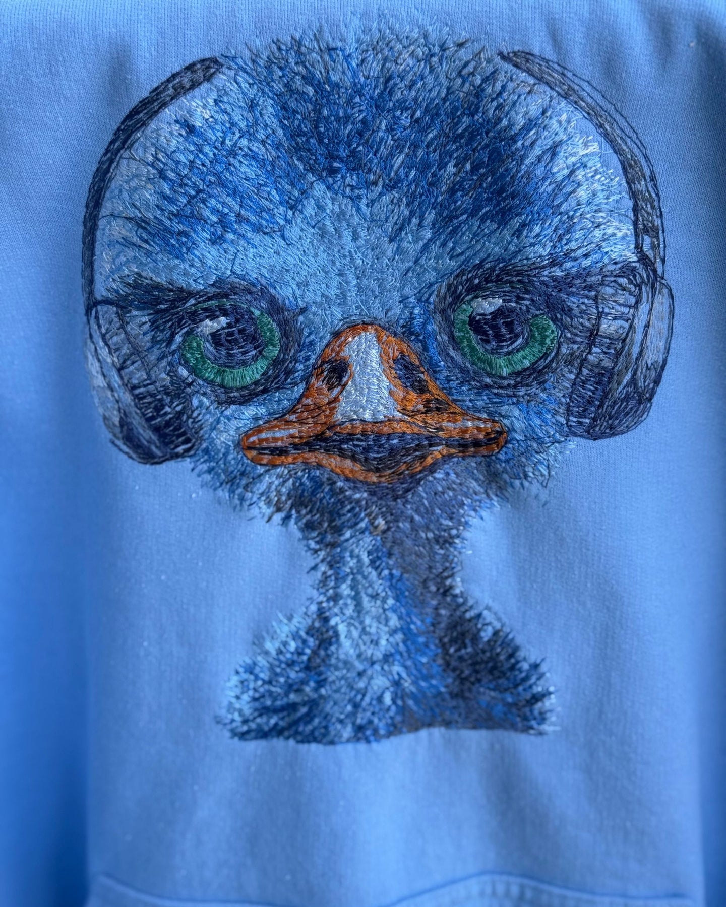 For your inner introvert. This Sky Blue Happy Hoodie features a focused ostrich wearing headphones, stitched in blue, black, and green thread. Whether you’re vibing out or tuning in, this one’s a wearable reset button.