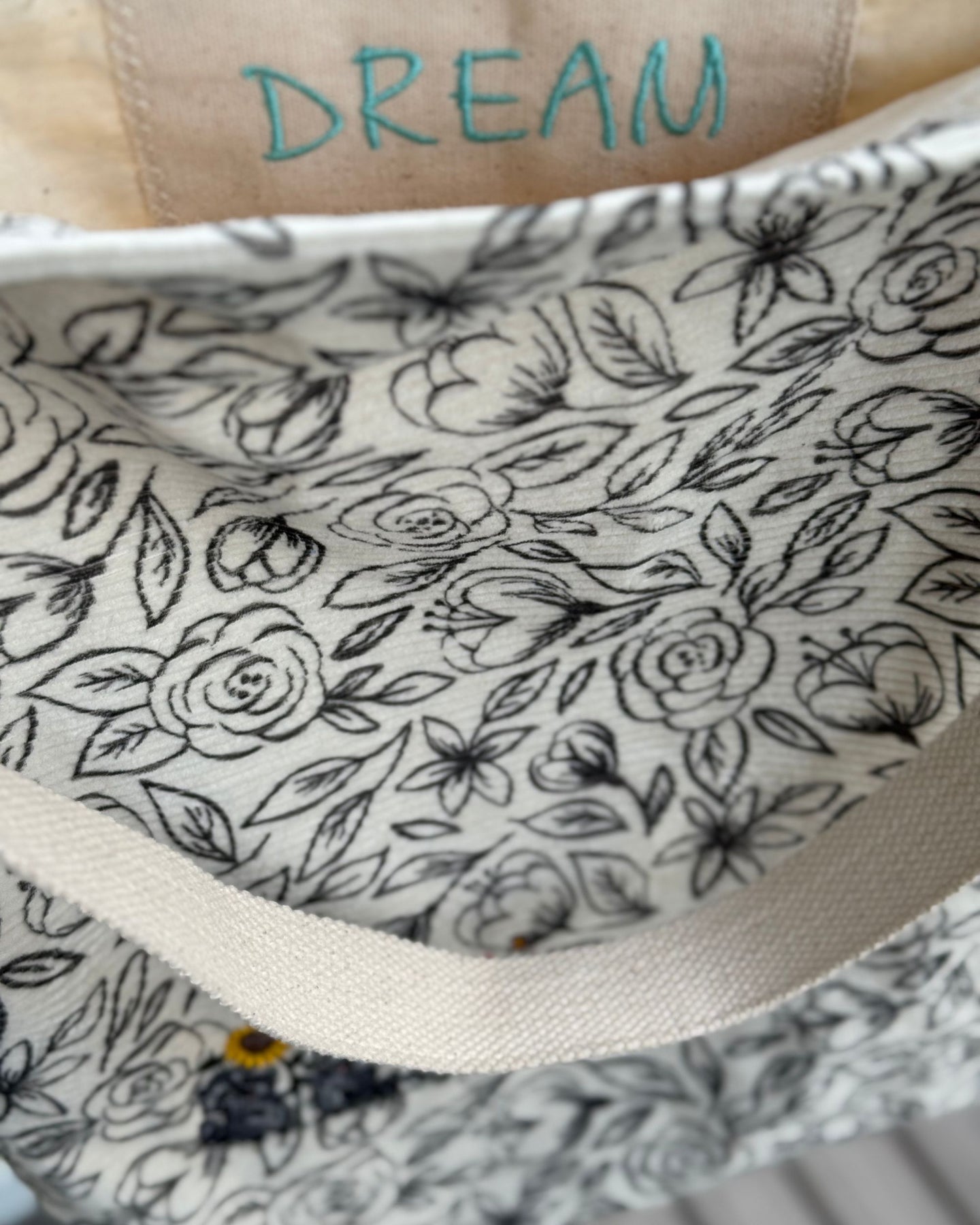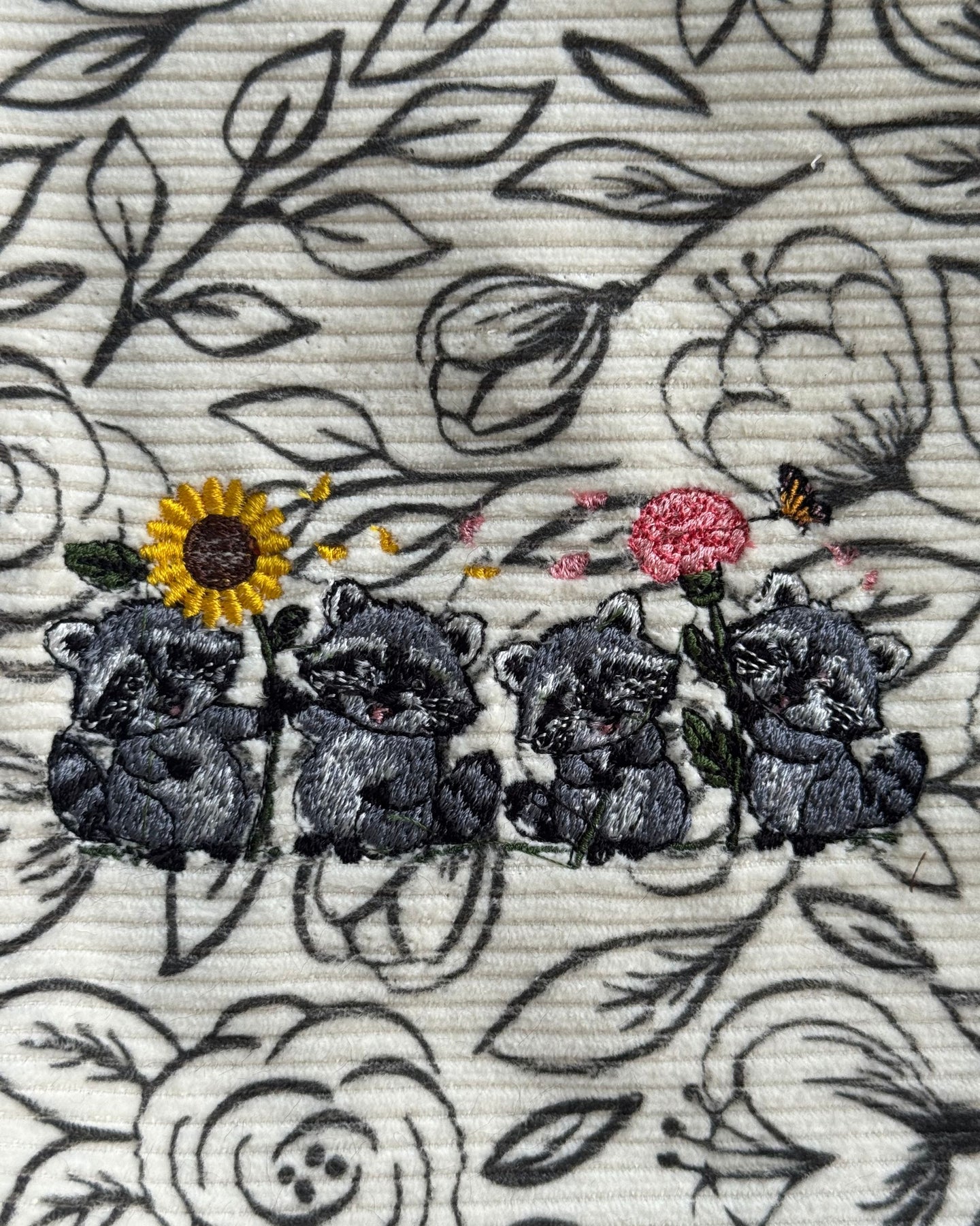Made with rich, textured Inked Rose corduroy, this tote features a playful scene of embroidered raccoons and florals, and is fully lined with soft cotton muslin for structure and comfort. Inside, the stitched message “dream” adds a quiet, personal touch — like a secret just for you.